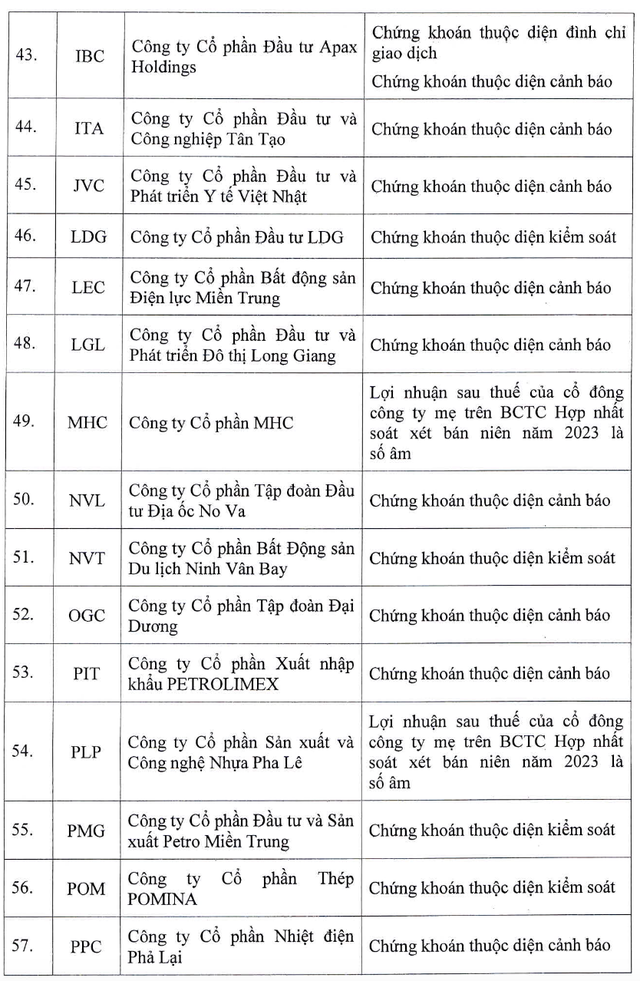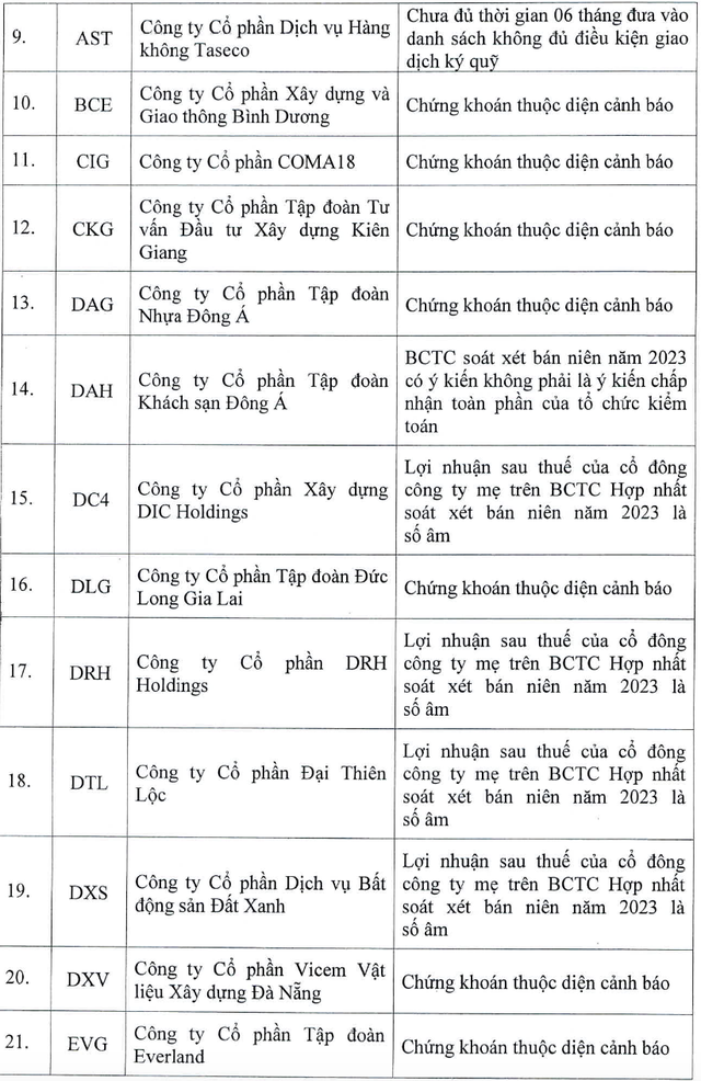 Ngoài ra, nhiều cổ phiếu do nằm trong diện chứng khoán bị cảnh báo hoặc kiểm soát nên theo quy định cũng bị cắt margin, gồm nhiều cái tên quen thuộc như: AGM, CIG, CKG, DAG, HBC, HAG, HNG, HVN, IBC, ITA, JVC, NVL, POM, PPC…