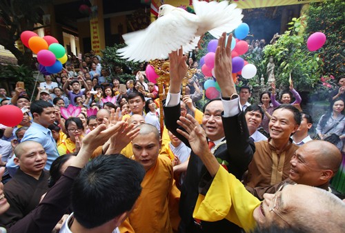 Chủ tịch nước Trần Đại Quang thả chim phóng sinh tại chùa Quán Sứ (Hà Nội) ngày21/5 (15/4 âm lịch). Ảnh:Ngọc Thành.