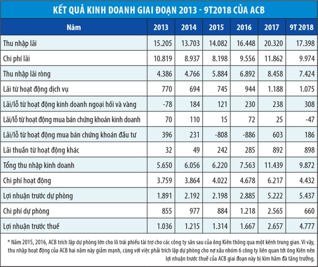 Trong 9 tháng đầu năm 2018, ACB đã hoàn thành 84% kế hoạch lợi nhuận trước thuế cả năm, các nguồn thu đều tăng trưởng tốt trên mức bình quân ngành và thị trường, ngoại trừ hoạt động mua bán chứng khoán kinh doanh và đầu tư (đây là hai mảng tăng trưởng âm so với cùng kỳ nhưng chiếm tỷ trọng không lớn trong tổng thu nhập hoạt động kinh doanh).