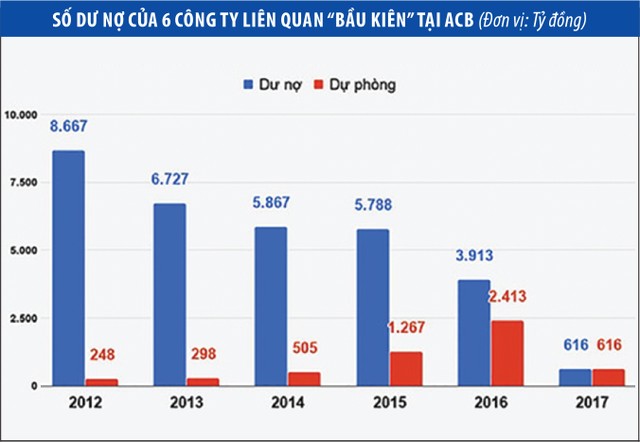 Sau 5 năm trích lập dự phòng, xử lý các khoản phải thu, tới cuối năm 2017, ACB còn dư nợ 3.568 tỷ đồng và các khoản phải thu khác trị giá 616 tỷ đồng tại nhóm G6 (số dư nợ của 6 công ty liên quan “bầu Kiên" tại ACB), đã được trích lập dự phòng đầy đủ. Tỷ lệ nợ xấu của ACB đã giảm về mức thấp so với mức bình quân trong hệ thống ngân hàng, chỉ còn 0,71%. Ngân hàng đã đáp ứng các chỉ số an toàn và có chất lượng tài sản tốt. Giai đoạn 2013 - 2017, hầu hết các chỉ tiêu tài chính của ACB liên tục tăng trưởng (xem bảng).