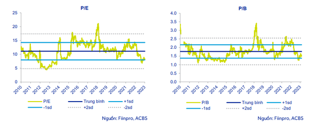 Tại ngày 7/3, ngành ngân hàng được giao dịch ở mức P/E là 8,1 lần và P/B là 1,5 lần, thấp hơn lần lượt 32,1% và 16,4% so với mức trung bình lịch sử 10 năm.