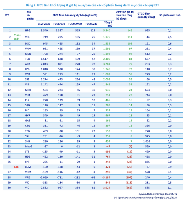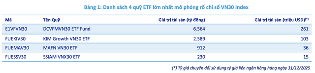 Hiện tại, có 4 quỹ ETF lớn mô phỏng rổ chỉ số VN30, và các quỹ này sẽ tiến hành cơ cấu danh mục đầu tư, việc cơ cầu dự kiến hoàn thành trước ngày 02/02/2026 (ngày hiệu lực của danh mục mới).