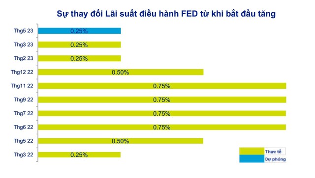 Cục Dự trữ Liên bang Mỹ (FED) đã quyết định tăng 0,25 điểm và phát ra tín hiệu trong dự báo kinh tế mới được FED đưa ra là vẫn giữ lộ trình lãi suất dự kiến cho năm 2023 là 5,25% và giữ nguyên mức này cho đến năm 2024.