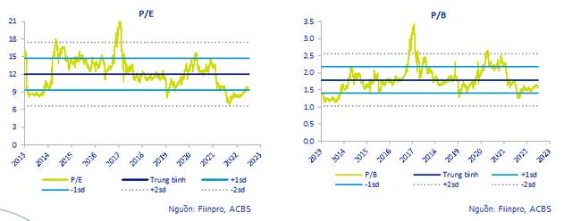 Nhìn về chuyển động giá cổ phiếu, theo ACBS, giá cổ phiếu ngành ngân hàng đã hồi phục 48% kể từ vùng đáy tháng 11/2022 và hiện đang giao dịch ở mức P/E là 9,3 lần và P/B là 1,8 lần, thấp hơn lần lượt 22,2% và 11,5% so với mức trung bình lịch sử 10 năm. Giá cổ phiếu ngành ngân hàng đã có sự phục hồi khá ấn tượng, tuy nhiên, hệ số giá trên thu nhập P/E của cổ phiếu ngành ngân hàng hiện vẫn đang thấp hơn 1 độ lệch chuẩn so với trung bình lịch sử là 12 lần.