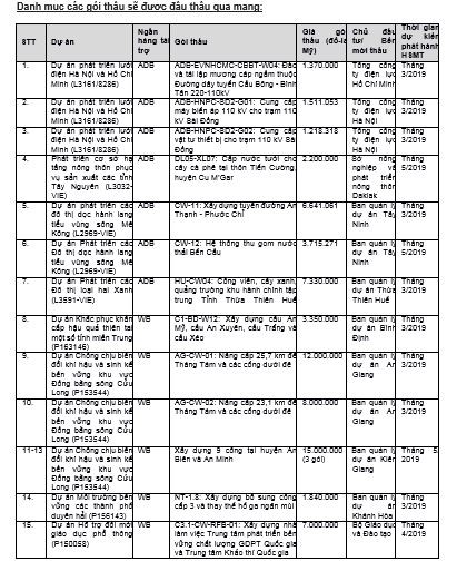 Trong giai đoạn đầu, 2 ngân hàng cùng các cơ quan liên quan dự kiến thực hiện đấu thầu qua mạng cho 15 gói thầu với tổng giá trị hơn 71 triệu USD như danh sách dưới đây. Thông tin chi tiết về các gói thầu đấu thầu qua mạng được đăng đầy đủ và thường xuyên cập nhật trên trang web http://muasamcong.mpi.gov.vn.