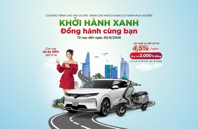 Mới đây, Agribank đã triển khai chương trình cho vay ưu đãi “Khởi hành xanh – Đồng hành cùng bạn” với quy mô tín dụng lên tới 2.000 tỷ đồng, dành cho khách hàng cá nhân có nhu cầu vay mua ô tô và xe máy điện. Chương trình áp dụng lãi suất ưu đãi từ 4,5%/năm, cố định đến 18 tháng, hỗ trợ vay tối đa 100% giá trị xe. Khách hàng có thể lựa chọn vay theo từng lần hoặc theo hạn mức quy mô nhỏ. Chương trình được triển khai từ nay đến hết ngày 30/6/2026 hoặc đến khi giải ngân hết hạn mức.