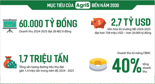 Đến năm 2030, AgriS đặt mục tiêu doanh thu 60.000 tỷ đồng, sản lượng tiêu thụ 1,7 triệu tấn đường, mở rộng danh mục sản phẩm từ mía, dừa, chuối, dứa, gạo và tăng hiện diện tại Úc, Singapore, Indonesia.