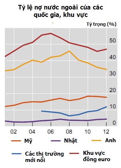 Biểu đồ trên cho thấy, mặc dù rất nỗ lực giảm nợ, nhưng khu vực đồng euro vẫn là nơi có tỷ lệ nợ nước ngoài cao nhất. Kế đến là Anh, Mỹ, Nhật và các thị trường mới nổi.