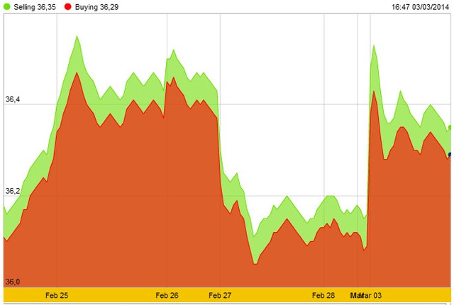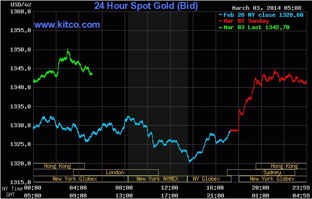 Giá vàng giao tháng 4 đã tăng 2,2% lên 1.350,5 USD/ounce ngay đầu giờ giao dịch sàn New York ngày hôm nay, mức cao nhất kể từ 30/10/2013. Sau đó, giá giảm nhẹ còn 1.345,2 USD/ounce lúc 7h43 chiều nay, theo giờ Việt Nam. Như vậy, với mức giá mới này, giá vàng tương lai đã tăng 12% kể từ đầu năm 2014.