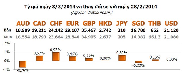 Các ngoại tệ khác, đa số tăng, trong đó CHF dẫn đầu với 0,93%; tiếp đến là JPY với 0,62%; CAD với 0,57%; EUR với 0,46%; GBP với 0,29%. Ở chiều giảm, chỉ có AUD giảm 0,76% và SGD giảm 0,22%.