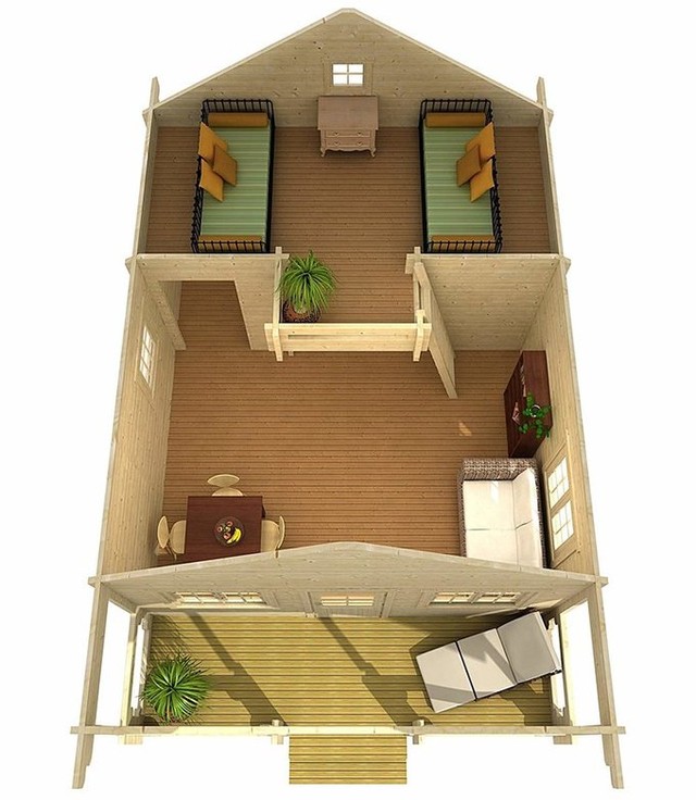 Sơ đồ thiết kế ngôi nhà bên trên cho thấy nó có không gian khá đơn giản. Tầng trệt bao gồm 3 căn phòng với tổng diện tích sàn khoảng 27 m2. Ngoài ra, còn có một phòng ngủ nằm trên tầng áp mái.