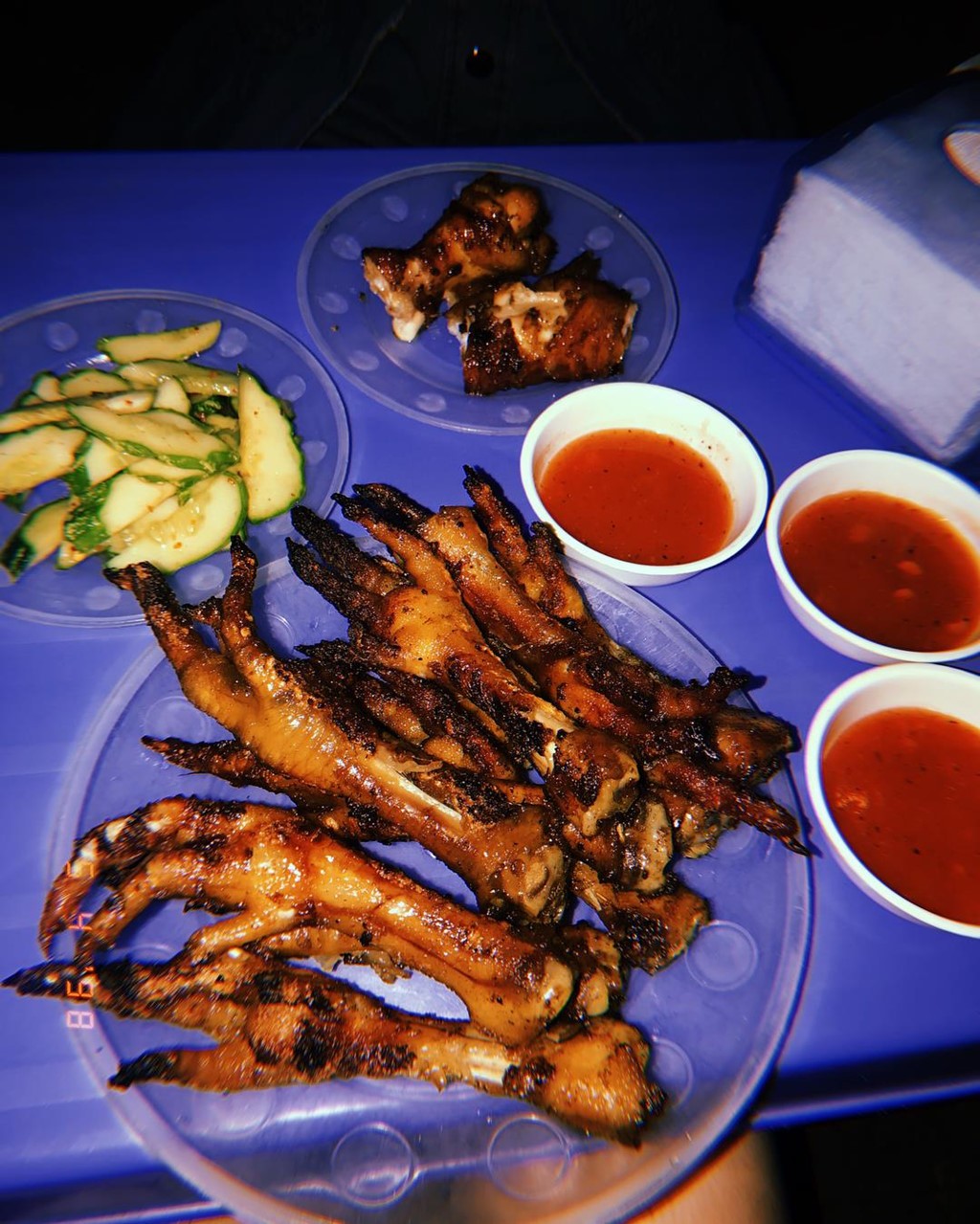 Nếu muốn ngồi lai rai cùng bạn bè vào ngày mưa, bạn có thể tới những quán bán chân gà nướng và uống vài ly bia. Chân gà nướng ở Hà Nội thường được ăn kèm với dưa chuột muối, xoài xanh thái mỏng chấm cùng ớt tương cay. Phố Bà Triệu, Tạ Quang Bửu là những nơi bạn nên tham khảo. Giá: 70.000-80.000 đồng/người.