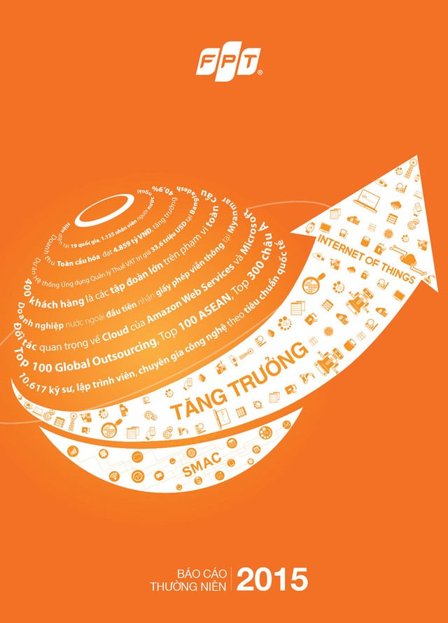 Nhiều con số về doanh thu, nhân sự, đối tác quan trọng, thứ hạng doanh nghiệp trong khu vực và toàn cầu… trong hình tượng quả cầu trên trang bìa Báo cáo thường niên 2015 đủ để nói lên tốc độ tăng trưởng mạnh mẽ của Tập đoàn FPT trong xu thế toàn cầu hóa. Với thế mạnh về công nghệ thông tin, một lượng lớn thông tin, số liệu kinh doanh của Tập đoàn đã được chuyển tải qua các đồ thị, sơ đồ hình cây hay mô hình “bản đồ tư duy”, giúp Báo cáo thường niên của FPT ấn tượng, dễ đọc, dễ nhớ.