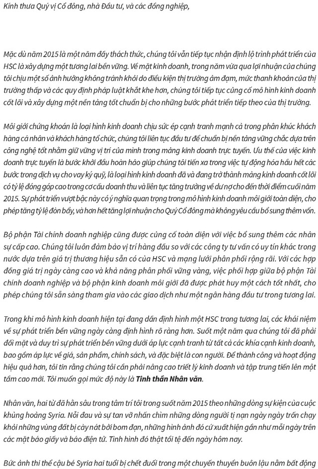 Lạ là cảm giác đầu tiên khi cầm trên tay cuốn Báo cáo thường niên của CTCK HSC, bởi chủ đề “Nhân văn” trên trang bìa tưởng chẳng ăn nhập gì với câu chuyện kinh doanh của một doanh nghiệp, nhưng bản thông điệp đầy xúc động của Tổng giám đốc HSC, ông Johan Nyvene ngay sau đó đã kiến giải rõ ràng về chữ “nhân văn”: Thực ra “tính nhân văn”, “tinh thần nhân văn” không thể tách rời với mục tiêu phát triển bền vững của doanh nghiệp, của xã hội, bởi sự phát triển của mỗi doanh nghiệp, mỗi xã hội đều phải dựa trên yếu tố cốt lõi, đó là con người và phải vì con người!