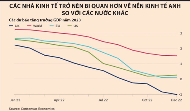 Các dự báo do Consensus Economics tổng hợp cho thấy, GDP năm 2023 của Anh sẽ giảm 1%, khu vực đồng tiền chung Euro tăng 0,1%, Mỹ tăng 0,25%, toàn cầu tăng 1,5%.