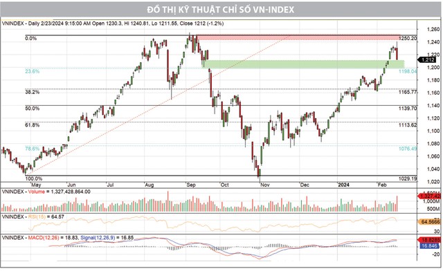 Dưới góc nhìn kỹ thuật, áp lực bán xuất hiện mạnh hơn trong phiên giao dịch cuối tuần khi nhà đầu tư ngắn hạn cố gắng bảo vệ thành quả có được trong nhịp tăng, nhưng ngưỡng hỗ trợ ngắn hạn của VN-Index quanh 1.200 điểm chưa bị vi phạm. Do đó, xu thế tăng ngắn hạn của thị trường được duy trì, dù nhịp điều chỉnh có thể khiến chỉ số kiểm định lại vùng hỗ trợ mới. Đồng thời, diễn biến này xuất hiện cũng được cho là đúng thời điểm khi chỉ số tiệm cận vùng đỉnh cũ hồi tháng 9/2023 tại 1.250 điểm. Để bứt phá thành công vùng cản đó, nới rộng dư địa tăng, thị trường có lẽ sẽ cần có thêm lực cầu.