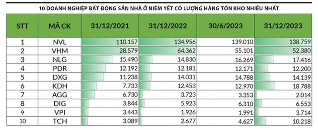 Thống kê 10 doanh nghiệp bất động sản nhà ở niêm yết có lượng hàng tồn kho nhiều nhất (xem bảng) cho thấy, tổng giá trị hàng tồn kho tính đến cuối năm 2023 đạt hơn 276.000 tỷ đồng (tương đương khoảng 11 tỷ USD), tăng hơn 3% so với đầu năm. Trong đó, giá trị hàng tồn kho của Novaland (mã NVL) là cao nhất, chiếm một nửa với gần 139.000 tỷ đồng và tương đương 57% tổng tài sản của doanh nghiệp này; tiếp theo là Vinhomes (mã VHM) với hơn 52.000 tỷ đồng, chiếm hơn 11% tổng tài sản; Khang Điền (mã KDH) là hơn 18.800 tỷ, chiếm hơn 71% tổng tài sản; Nam Long (mã NLG) là hơn 17.400 tỷ đồng, chiếm hơn 60% tổng tài sản; Đất Xanh (mã DXG) là hơn 14.100 tỷ đồng, chiếm hơn 47% tổng tài sản; Phát Đạt (mã PDR) là hơn 12.200 tỷ đồng, chiếm hơn 58% tổng tài sản; Hoàng Huy (mã TCH) là 10.218 tỷ đồng, chiếm 61% tổng tài sản…