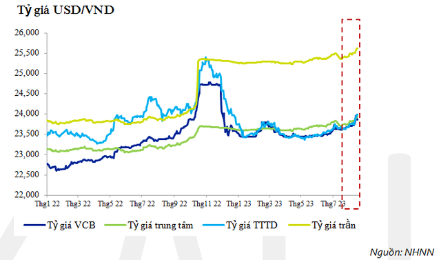 Theo CTCK VNDirect, áp lực tỷ giá gia tăng trong tháng 7 và đầu tháng 8 là rất lớn. Cụ thể, tỷ giá USD/VND liên ngân hàng giao dịch ở mức 23.761 tại ngày 3/8/2023 (tăng gần 0,8% so với thời điểm cuối tháng 6). Tính từ đầu năm 2023, tỷ giá USD/VND đã tăng khoảng 0,5%.