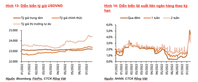 Tóm tắt về diễn biến trong nước trong tháng 7/2022, theo VDSC, NHNN đã tích cực can thiệp thông qua thị trường mở và phát hành tín phiếu để điều tiết thanh khoản tiền đồng trong hệ thống ngân hàng, đồng thời giúp kiềm giữ đà tăng của tỷ giá.