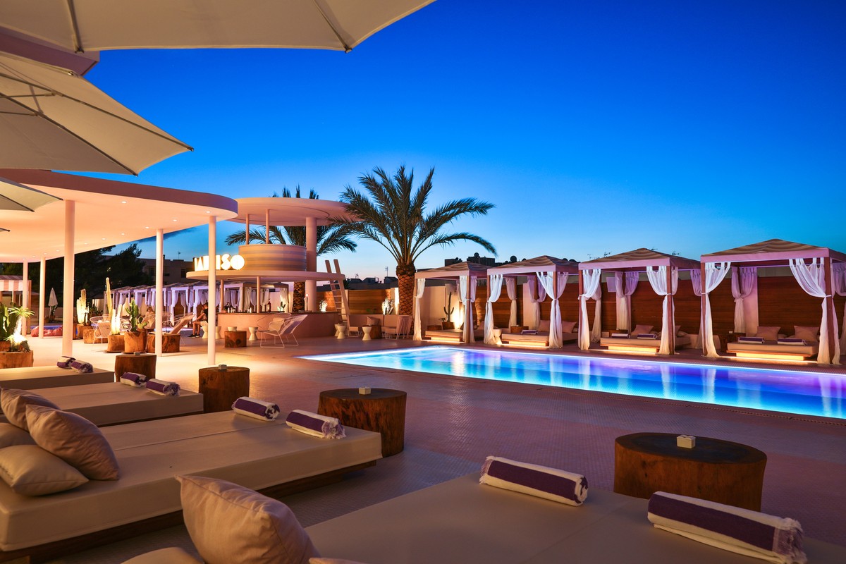 Từ khu vực này, có thể ngắm nghía toàn cảnh không gian ngọt ngào sắc màu của Art Hotel Paradiso Ibiza, với sự nổi bật của sắc hồng và tím từ sàn nhà kéo dài tới trần.