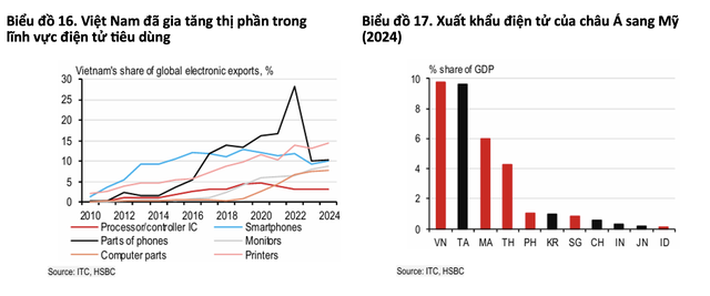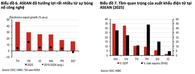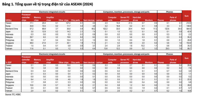 HSBC nhấn mạnh, Malaysia và Việt Nam nổi lên là những nền kinh tế hưởng lợi lớn nhất, khi xuất khẩu điện tử chiếm tỷ trọng cao trong GDP. Singapore, dù tỷ trọng thấp hơn, lại hưởng lợi gián tiếp thông qua các ngành liên quan như cơ khí chính xác và dịch vụ thương mại.