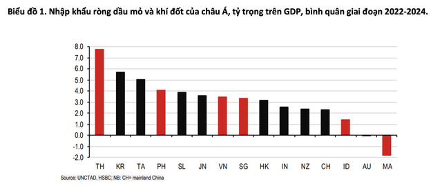 Với ASEAN, Báo cáo nhận định, dù tỷ trọng thương mại trực tiếp với Trung Đông không lớn, khu vực này vẫn chịu tác động rõ rệt thông qua hai mặt hàng chiến lược: dầu mỏ và khí đốt. Ngoại trừ Malaysia, phần lớn các nền kinh tế ASEAN là nước nhập khẩu năng lượng ròng, trong đó Thái Lan có mức chi phí năng lượng tính trên GDP cao nhất khu vực. Đáng chú ý hơn, phần lớn nguồn cung năng lượng nhập khẩu đến từ Trung Đông, với tỷ trọng trên 50% ở nhiều quốc gia, thậm chí lên tới khoảng 80% tại Philippines.