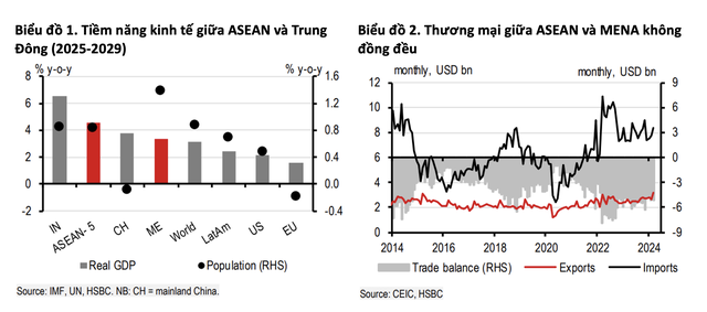 Theo HSBC, quan hệ thương mại giữa ASEAN và MENA (các nước thành viên Hội đồng hợp tác các nước vùng Vịnh (GCC) và Ai Cập) đã thu hút sự chú ý khi những gián đoạn ở Biển Đỏ bắt đầu xảy ra. Tương tự như thương mại giữa Trung Quốc với MENA, thương mại ASEAN-MENA, với tổng giá trị năm 2023 đạt hơn 126 tỷ USD, có phần không đồng đều. Mặc dù xuất khẩu từ ASEAN sang MENA đang tăng trưởng ở mức hai con số kể từ 2024, giá trị xuất khẩu tuyệt đối lại chỉ bằng một phần ba của nhập khẩu. Rõ ràng, ASEAN đã liên tục chứng kiến mức độ thâm hụt thương mại lớn với MENA, mức cao nhất là hơn 5 tỷ USD/tháng, mới chỉ thu hẹp nhẹ ngay sau đợt bùng dịch đầu tiên khi giá dầu sụt giảm.