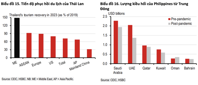 Báo cáo nhận định: “Không như Thái Lan tập trung vào ngành du lịch, Philippines có một lộ trình khác với MENA thông qua kiều hối từ xuất khẩu lao động. Tổng kiều hối chiếm gần 10% GDP, trong đó chỉ riêng Trung Đông đã chiếm một phần tương đối lớn là 17% trong năm 2023. Tuy nhiên, con số này cũng đã giảm mạnh so với đỉnh của năm 2017 là 28%, tình hình chung diễn ra tại tất cả các nước MENA. Câu chuyện phần nào phản ánh cơ hội việc làm tốt hơn ở quê nhà và những nơi khác”.