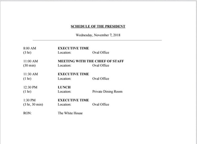 Lịch trình ngày 4/2 của ông Trump, được đưa ra bởi văn phòng báo chí, vẫn cho thấy một sự khởi đầu muộn màng như thường lệ. Tổng thống vừa nghỉ 2 ngày cuối tuần tại câu lạc bộ golf của ông ở Florida, và sẽ bắt đầu ngày thứ hai với báo cáo tình báo vào lúc 11 giờ 45 phút sáng, và sau đó là cuộc gặp với Phó tổng thống Mike Pence vào lúc 12 giờ 45 phút trưa.