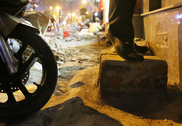 Vẫn trên phố Xã Đàn, một cây ATM khác khi không còn bậc tam cấp, người dân đặt tạm hai trụ bê tông cao hơn 40 cm để rút tiền. Tuy nhiên, nhiều người vẫn phải kiễng chân mới với tới.
