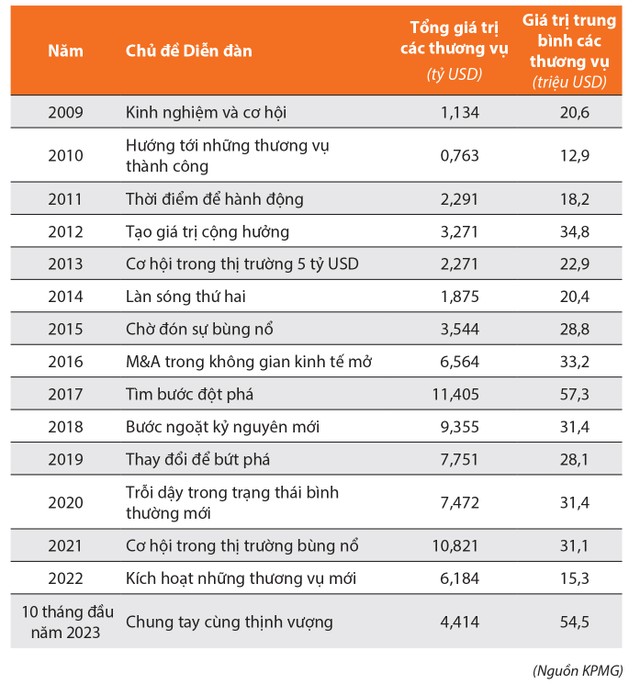 Thống kê từ KPMG cho thấy, quy mô thị trường M&A Việt Nam qua các năm đã có được những bước tăng trưởng ấn tượng. Năm 2008, tổng giá trị các thương vụ là 1,134 tỷ USD; năm 2009: 763 triệu USD; năm 2010: 2,291 tỷ USD; năm 2011: 3,271 tỷ USD; năm 2012: 4,369 tỷ USD; năm 2013: 2,271 USD; năm 2014: 1,875 tỷ USD; năm 2015: 3,544 tỷ USD; năm 2016: 6,564 tỷ USD; năm 2017: 11,405 tỷ USD; năm 2018: 9,355 tỷ USD; năm 2019: 7,751 tỷ USD; năm 2020: 7,472 tỷ USD; năm 2021: 10,821 tỷ USD; năm 2022: 6,184 tỷ USD và 10 tháng đầu năm 2023: 4,414 tỷ USD.