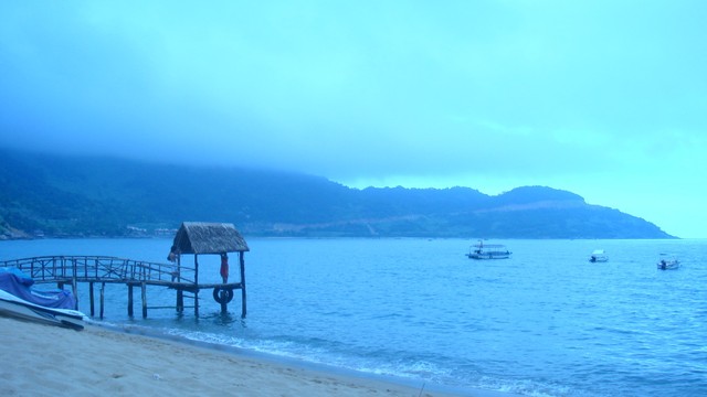 Không ngủ được nhiều, tôi thức giấc từ sớm, khoác chiếc khăn mỏng vào người rồi đi bộ dọc xuống bãi Đông. Biển bây giờ lặng gió. Có thể nghe trong làn sương sớm vị mặn của biển. Lành lạnh, phản phất, mơn man khắp cơ thể. Mặt trời đã dần nhô lên từ phía sau ngọn núi sừng sững. Những tia nắng hạnh phúc xé tan màn sương đêm. Bầu trời như được thay một lớp áo mới rực rỡ. Không gian xung quanh trở nên lung linh hơn.