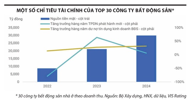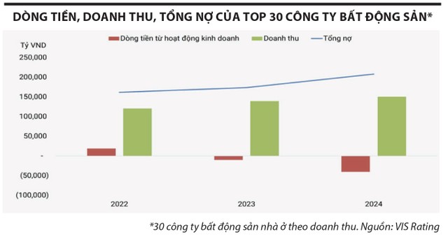 Thống kê của VIS Rating đối với 30 chủ đầu tư bất động sản nhà ở niêm yết lớn nhất theo doanh thu cho thấy, tổng nợ tính đến cuối năm 2024 tăng 20% so với cùng kỳ năm 2023, lên 208.000 tỷ đồng, phần lớn để tài trợ chi phí phát triển dự án như Vinhomes, Nam Long, Đất Xanh, bổ sung vốn lưu động hoặc tái cấu trúc nợ đến hạn như Novaland, Năm Bảy Bảy. Sự gia tăng nợ này dẫn đến chi phí lãi vay trong năm qua tăng 41%.
