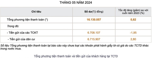 Số liệu mới nhất được Ngân hàng Nhà nước công bố cho biết, tính đến tháng 5/2024, mặc dù tiền gửi của dân cư đạt 6.715.907 tỷ đồng, tăng 2,8% so với cuối năm 2023 nhưng tiền gửi của các tổ chức kinh tế chỉ đạt 6.708.107 tỷ đồng, giảm 1,95% so với cuối năm 2023.
