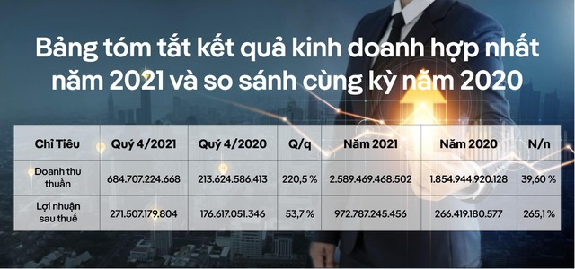 Theo đó, trong quý IV/2021, Công ty đạt doanh thu thuần hơn 648 tỷ đồng, tăng 220,5%, lợi nhuận sau thuế đạt gần 272 tỷ đồng, tăng 53,7% so với cùng. Luỹ kế cả năm 2021, BCG đạt hơn 2.589 tỷ đồng doanh thu, tăng gần 40% và gần 973 tỷ đồng lợi nhuận, tăng vọt hơn 265% so với năm 2020.
