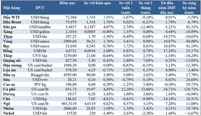(ĐTCK) Thị trường hàng hóa ngày 11/02 chứng kiến sự phục hồi của giá bạc và dầu sau những phiên điều chỉnh trước đó. Trong khi bạc tăng nhẹ cả trong nước lẫn quốc tế, dầu Brent và WTI bật tăng gần 2% bất chấp lo ngại về chiến tranh thương mại.