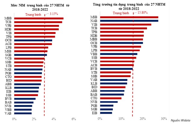 Bảng bên dưới thể hiện thống kê về mức tăng trưởng tín dụng và mức NIM của các ngân hàng niêm yết hiện tại, phân theo hai nhóm là nhóm màu đỏ là các ngân hàng được Ngân hàng Nhà nước xếp vào nhóm các ngân hàng thương mại quan trọng của ngành theo Thông tư 08/2017/TT-NHNN. Điểm đáng lưu ý ở đây là dựa trên mức NIM trung bình 5 năm hơn 3,1% thì sẽ có một số ngân hàng có tỷ lệ NIM thấp hơn hẳn và tăng trưởng tín dụng cũng thấp hơn. Các ngân hàng không được xếp vào nhóm quan trọng thường rơi vào nhóm NIM thấp, hoặc tăng trưởng tín dụng thấp, hoặc cả hai.