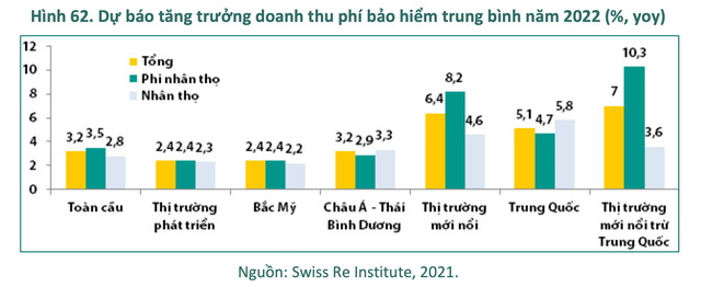 Cũng theo SRI, thị trường bảo hiểm năm 2022 sẽ tăng trưởng tương đối tích cực. Doanh thu phí bảo hiểm toàn cầu dự báo sẽ vượt ngưỡng 7.000 tỷ USD từ khoảng giữa năm 2022 và tăng khoảng 3,2% so với năm trước theo giá trị thực tế; trong đó doanh thu phí bảo hiểm phi nhân thọ sẽ tăng khoảng 3,7% và bảo hiểm nhân thọ tăng khoảng 2,9%.