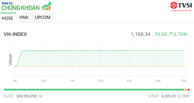 Đóng cửa, sàn HOSE có 534 mã tăng, trong đó, có tới 372 mã tăng kịch trần và chỉ 7 mã giảm, chỉ số VN-Index tăng 74,04 điểm (+6,77%), lên 1.168,34 điểm. Tổng khối lượng giao dịch đạt gần 370 triệu đơn vị, giá trị hơn 6.305,9 tỷ đồng, trong khi phiên hôm qua khớp hơn 1,16 tỷ đơn vị, giá trị hơn 32.402 tỷ đồng. Giao dịch thỏa thuận đóng góp hơn 89,6 triệu đơn vị, giá trị 1.646 tỷ đồng.