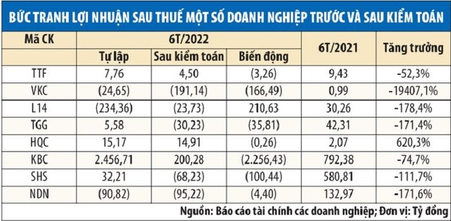 Ngoài ra, một số doanh nghiệp báo cáo lợi nhuận giảm mạnh sau kiểm toán. Trong đó, Tổng công ty Phát triển Đô thị Kinh Bắc (mã KBC) giảm 2.256,43 tỷ đồng, về 200,28 tỷ đồng; Công ty cổ phần Tập đoàn Kỹ nghệ gỗ Trường Thành (mã TTF) giảm 3,26 tỷ đồng, về 4,5 tỷ đồng; Công ty cổ phần Tư vấn Thương mại Dịch vụ Địa ốc Hoàng Quân (mã HQC) giảm 0,26 tỷ đồng, về 14,91 tỷ đồng.