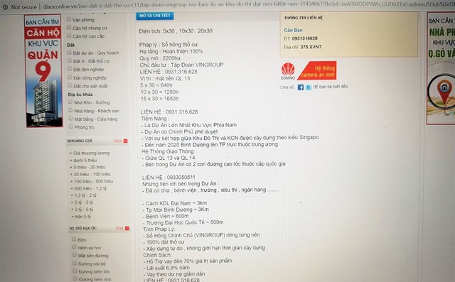 Cụ thể, thông tin trên trang mạng DiaOconline.VN (diaoconline.vn) không nêu rõ vị trí dự án, mà chỉ đưa thông tin dự án có diện tích 5x30, 10x30, 20x30. Pháp lý sổ hồng thổ cư, hạ tầng hoàn thiện 100%, quy mô 2.200 ha, đặc biệt chủ đầu tư là Tập đoàn Vingroup… Giá bán từ 640 triệu đồng tới 1,650 tỷ đồng và có số điện thoại liên lạc.