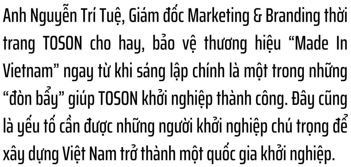 Bên cạnh đó, chúng tôi tin rằng, một thương hiệu thời trang của người Việt sẽ được người Việt Nam ủng hộ. Bởi, chúng tôi có những yếu tố mà các thương hiệu quốc tế và toàn cầu không có được. Đơn cử như sự thấu hiểu khách hàng, khả năng ứng biến linh hoạt và nhanh nhạy. Các thiết kế của TOSON là sự kết hợp hài hòa giữa phong cách hiện đại và những yếu tố mang tính bản sắc dân tộc…