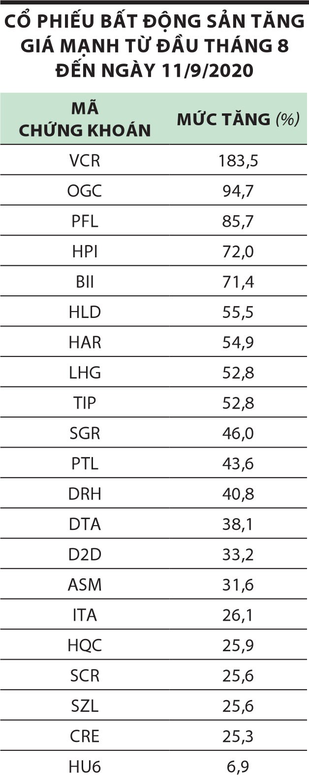 Sau giai đoạn giao dịch trầm lắng, nhóm cổ phiếu bất động sản dần dần có diễn biến khả quan và bắt đầu tăng mạnh kể từ đầu tháng 8. Tính đến ngày 11/9, cổ phiếu VCR của Công ty cổ phần Đầu tư và Phát triển Du lịch Vinaconex có mức tăng 141,1%.