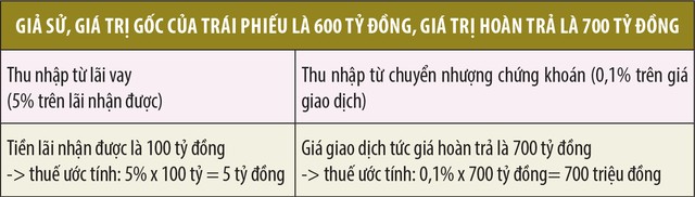 Với ví dụ cụ thể dưới đây, trong trường hợp hoàn trả nợ gốc trái phiếu cao hơn mệnh giá, khi so sánh số thuế phải nộp khi áp dụng cả hai mức thuế suất đề cập ở trên, ta dễ dàng nhìn thấy mức thuế dựa trên quy định về chuyển nhượng chứng khoán sẽ có lợi hơn cho các tổ chức nước ngoài (xem bảng).