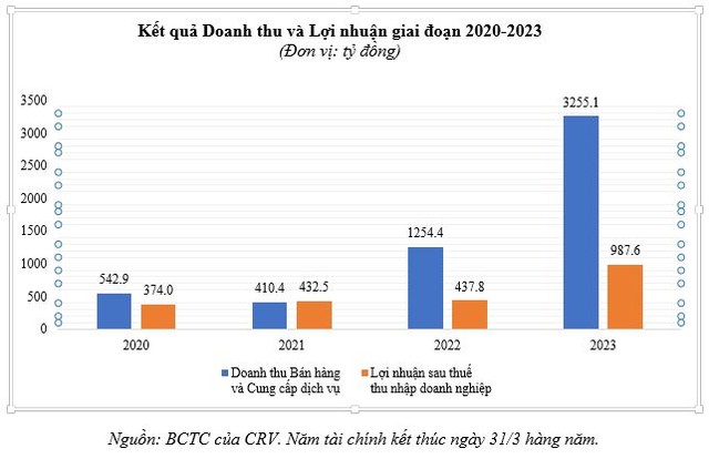 Theo báo cáo tài chính kiểm toán mới nhất được công bố, kết quả kinh doanh năm tài chính 2023 (giai đoạn từ 01/04/2023-31/03/2024) có những cải thiện đáng kể. Cụ thể, doanh thu bán hàng và cung cấp dịch vụ hợp nhất của CRV đạt 3.255 tỷ đồng tăng 159,6% so với năm trước. Nhờ đó, lợi nhuận sau thuế trên báo cáo hợp nhất đạt 987,61 tỷ đồng, tăng 125,6% so với năm 2022. Tỷ suất lợi nhuận gộp 2 năm tài chính gần nhất 2022 và 2023 lần lượt đạt 34,5% và 30,3% cho thấy sự hiệu quả ổn định trong hoạt động kinh doanh của CRV.