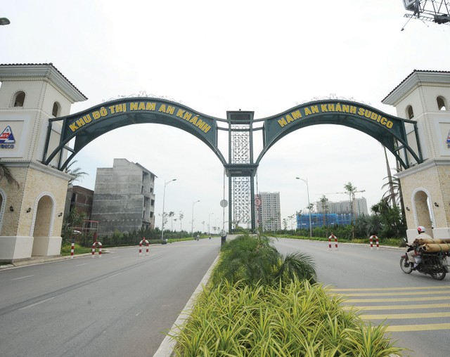 Cổng vào khu đô thị Nam An Khánh tấp nập người qua lại. Khoảng 500 tỷ đồng đã được đầu tư vào các hạng mục hạ tầng và cảnh quan của Khu đô thị Nam An Khánh