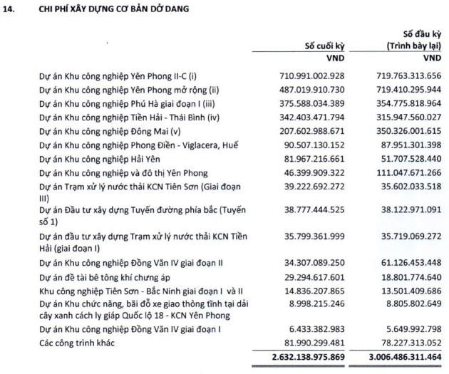 Về chi phí xây dựng cơ bản dở dang, tính đến 30/6/2021, giá trị mà Viglacera ghi nhận là 2.632 tỷ đồng, giảm 12% so với đầu kỳ. Giá trị chủ yếu được ghi nhận trong chi phí xây dựng cơ bản dở dang nằm tại các dự án khu công nghiệp.