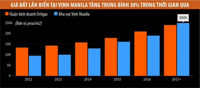 Giá bất động sản lấn biển tại khu vực Vịnh Manila, vốn đang là nơi đóng đô của các casino nổi tiếng bậc nhất như City of Dreams Manila, Solaire Resort and Casino, dự kiến sẽ tăng 30%, lên mức 250.000 pesos (4.900 USD)/m2 cho tới cuối năm nay, theo Colliers International. Mức giá này vượt xa so với đất đai tại khu vực Ortigas, nổi danh hàng thập kỷ qua nhờ sự phát triển của hoạt động kinh doanh, văn phòng, bán lẻ tại quốc gia Đông Nam Á này.