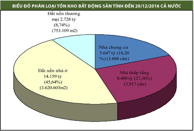 Tính đến ngày 20/12/2016, tổng giá trị tồn kho bất động sản còn khoảng 31.023 tỷ đồng, giảm 819 tỷ đồng so với tháng trước và giảm 19.866 tỷ đồng so với cùng kỳ năm 2015 (39,04%). Những con số trên cho thấy, tồn kho bất động sản tiếp tục giảm, song tốc độ đã chậm lại. Lượng tồn kho chủ yếu là đất nền tại các dự án xa trung tâm, chưa có hạ tầng đầy đủ.