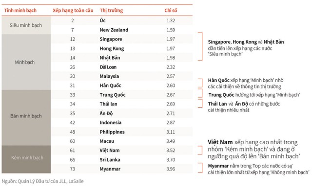 Thông tin rất được quan tâm trên thị trường bất động sản tuần vừa qua là việc Công ty Tư vấn Jones Lang Lasalle (JLL) công bố Báo cáo minh bạch bất động sản châu Á - Thái Bình Dương. Theo đó, tại Đông Nam Á, Thái Lan và Việt Nam được xếp hạng vào những thị trường có chỉ số minh bạch tăng trưởng ấn tượng nhất, ở ngưỡng quá độ lên nhóm "Bán minh bạch" và "Minh bạch".